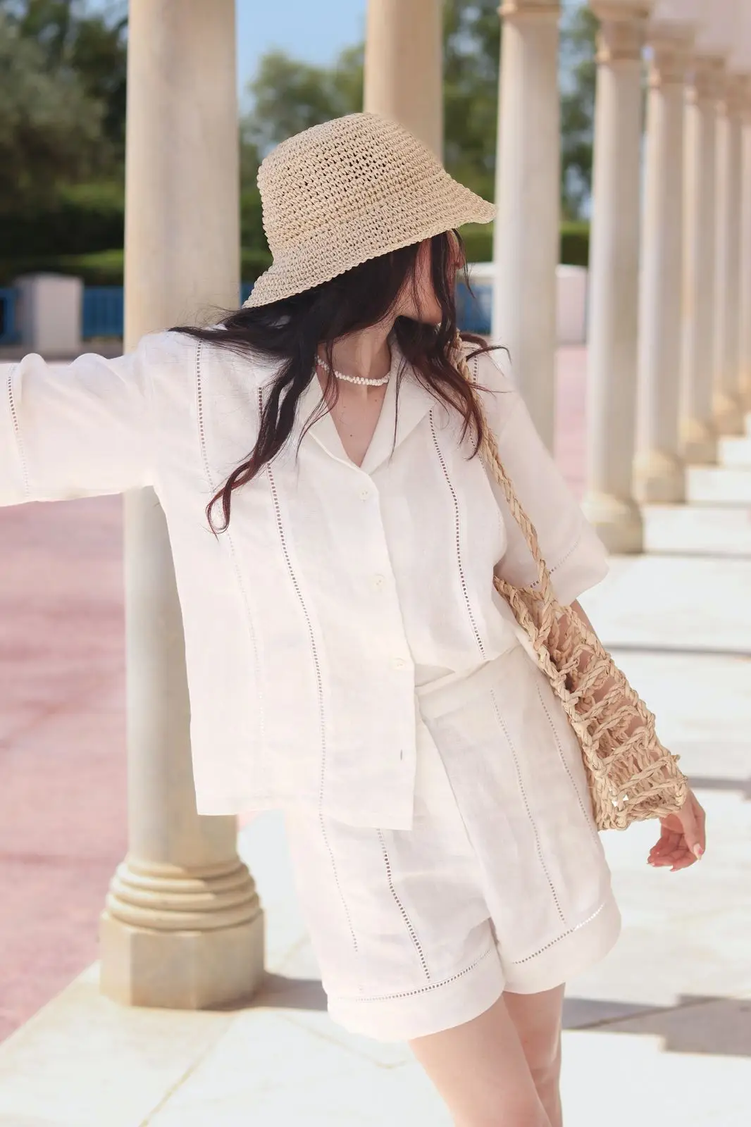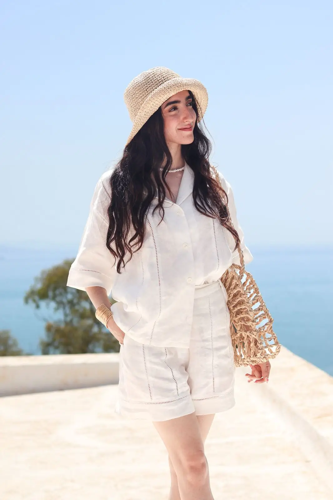 A crisp white matching shirt and shorts set in pure linen, featuring delicate openwork details for a refined summer look. Lightweight, breathable, and effortlessly chic.